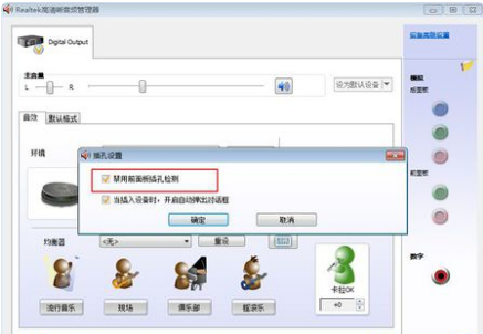 4、勾选“禁用前面板插孔检测”,点击确定,这时候后右下角的小喇叭红叉就消失了,电脑就有声音了。