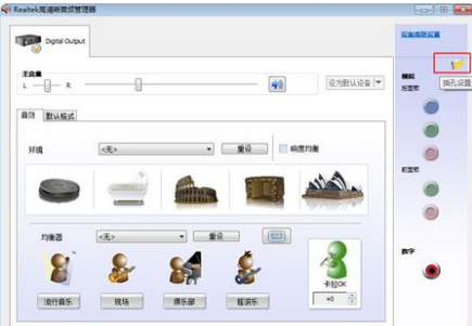 3、在Realtek高清晰音频管理器右上角,点击黄色文件夹图标,这个是插孔设置图标;