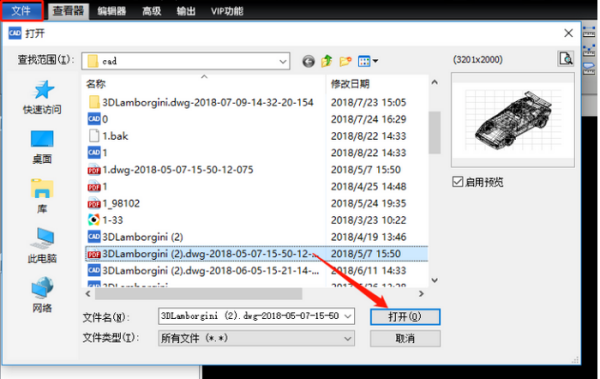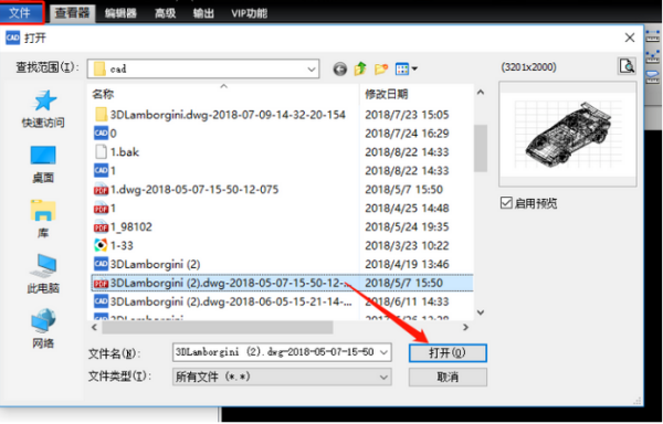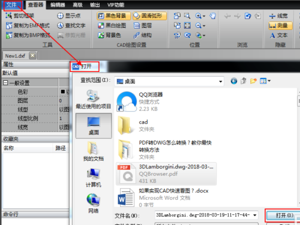 2、操作运行软件,点击界面上方“文件”按钮,再点击“打开”按钮,在弹出的窗口里面找到需要操作图纸文件,点击“打开”。如下图: