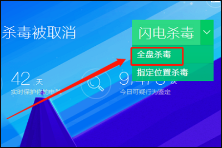 2、然后点击右边“闪电杀毒”下拉箭头,选择全盘查杀还是指定位置杀毒,小编这里点击“全盘杀毒”。