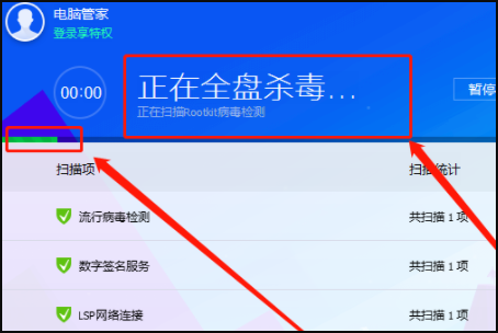 3、点击闪电查杀--全盘杀毒,开始检测电脑中安全问题和病毒,这是电脑会卡,会变慢,需要稍等片刻。
