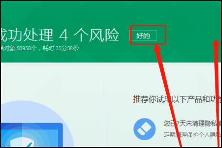 6、点处理完成之后,上面的面板显示绿色,然后点击“好的”按钮,即可返回病毒查杀页面。