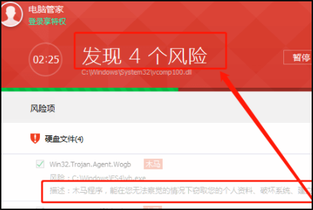4、点检测中,发现问题或病毒,会列表显示出来。