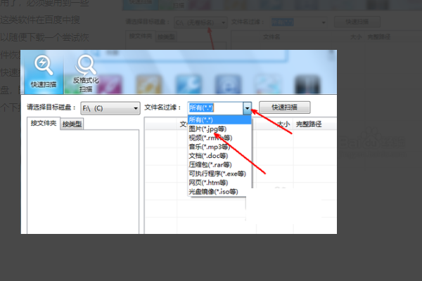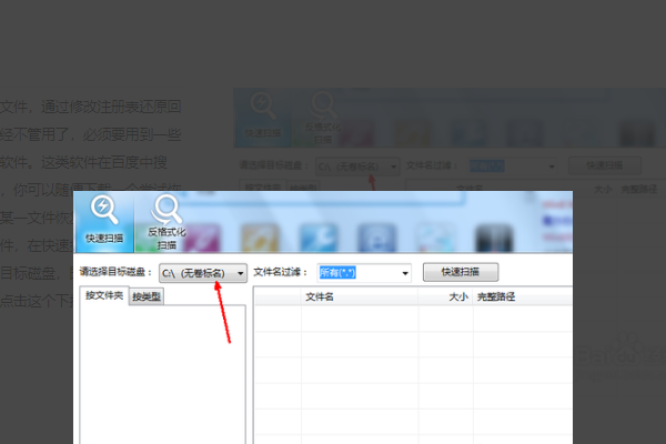 1、首先打开文件恢复软件,在快速扫描一栏里面。首先我们要选择目标磁盘,即你曾经删除重要文件的磁盘。点击这个下拉菜单。如图所示。