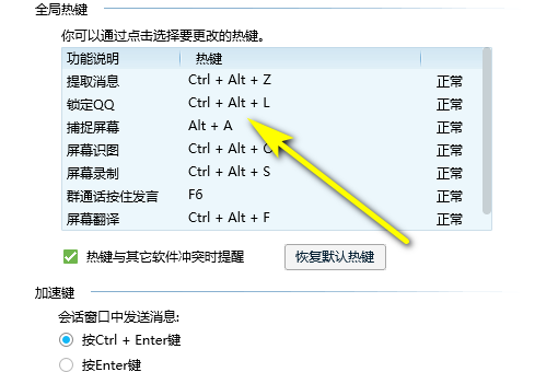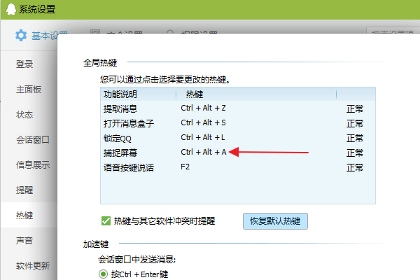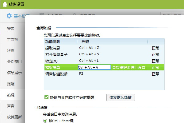 电脑alt+a变截屏了可以通过QQ更改热键: