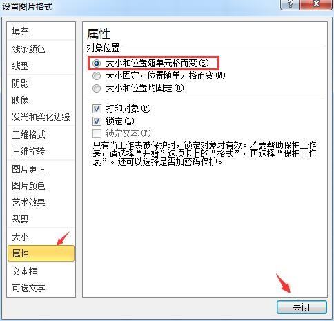 5、点击”属性“选项,在对象位置下方选择”大小和位置随单元格而变“选项并按”关闭“按钮。
