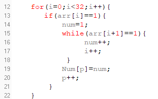 思想:当arr[i]为1时,计num为1,循环遍历当前元素之后的元素arr[i+1],如果arr[i+1]也是1,则计数num+1,i也+1,再次while循环,此时就是相当于看arr[i+1+1],如果还是1,则再重复前面的步骤,直到出现0为止。出现0后,while循环结束,把本次统计得到的num存到Num[]数组中,p++。最终整个for循环结束后,就能得到计数数组Num[]了。