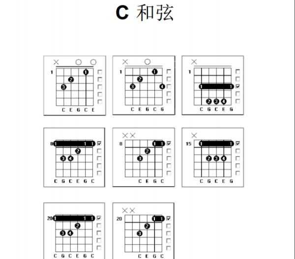 高把位和弦一般都是低把位和弦的另一种按法(和弦是同一个),例如C和弦有第1、3、5、8、10、12、15、17、20品的按法(理论上是这样的,实际上超过12品的几乎不用到):