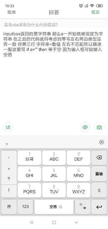 inputbox返回的是字符串 那么a一开始就被设定为字符串 在之后的代码就得考虑到等号左右两边类型是否一致 你第三行 字符串=数值 左右不匹配所以错误 一般这里写 if a="" then 等于空 因为输入框可能输入空值