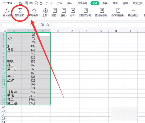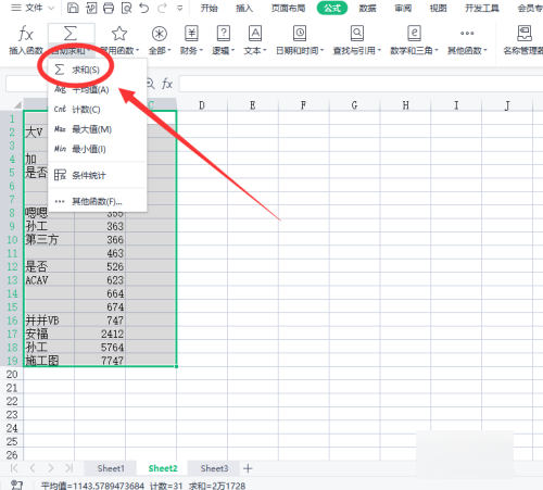 3、然后在【公式】子菜单中选择【自动求和】图标。
