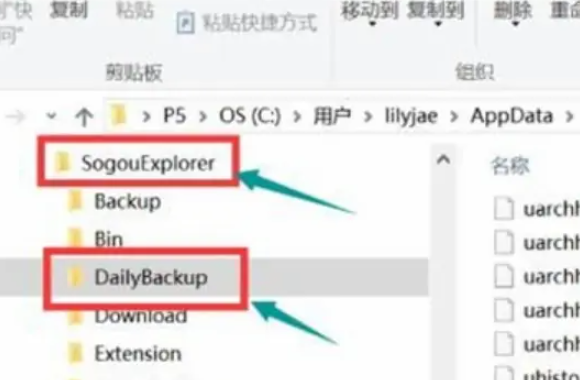 4、进入界面,左侧栏点击sogouexplorer/Dailybackup文件夹,在里面找到uhistroy3.db.日期,日期选择前一天的。鼠标点击这个文件,键盘按住CTRL+c。