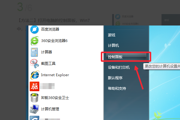 3、然后】打开电脑的控制面板,Win7中,点击开始菜单,打开控制面板。