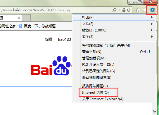 一、首先打开IE浏览器,点击右上角“设置”,下拉菜单内点击“Internet选项”。