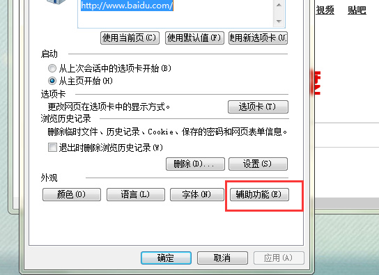二、打开Internet选项窗口后,点击“辅助功能”。