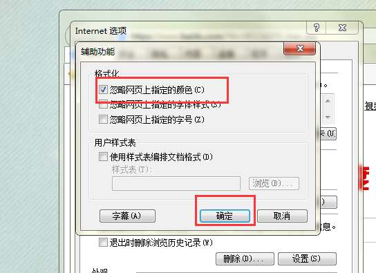三、勾选“忽略网页上指定的颜色”,点击“确定”。
