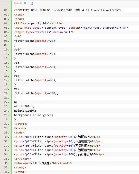 IE下透明度设置的方法是:filter:alpha(opacity=opacityValue);