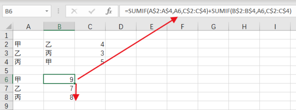 =SUMIF(A$2:A$4,A6,C$2:C$4)+SUMIF(B$2:B$4,A6,C$2:C$4)