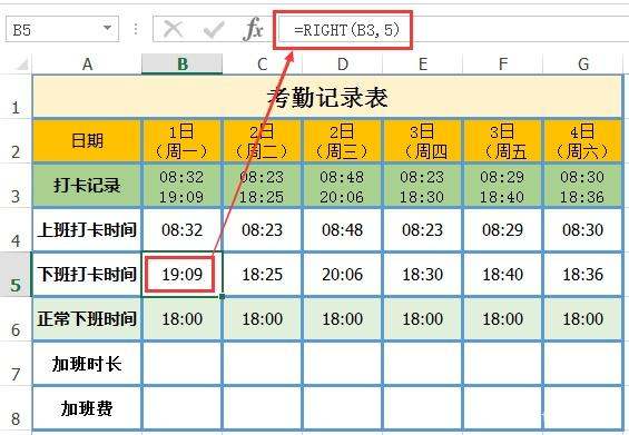公式解析:=RIGHT(B3,5)表示在B3单元格中的字符串中从右边往左数提取5个字符,即19:09