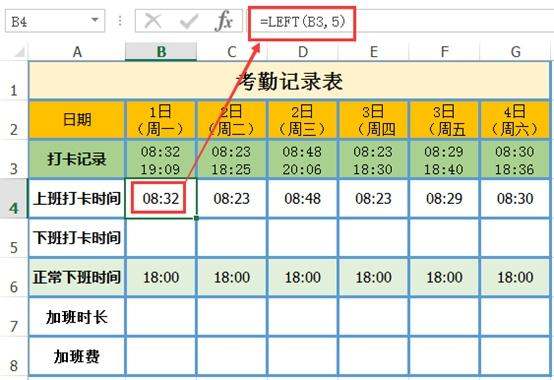 公式解析:=LEFT(B3,5) 表示在B3单元格的字符串中从左开始提取5个字符,即08:32。