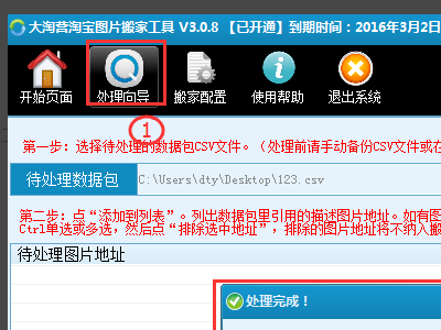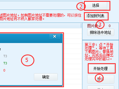 2、把要处理数据包中的csv选择进搬家工具(如②)点添加列表(如③)等待图片地址全部出来后,然后点开始处理(如④)等待工具全部处理完成后,会弹出一个提示成功的窗口。