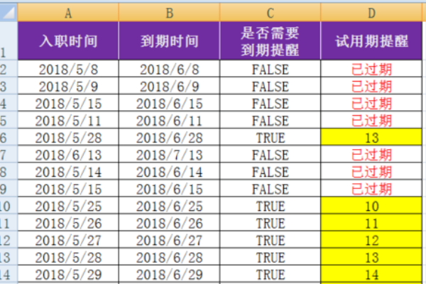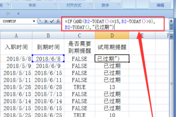 7、在试用期提醒的D2单位元格里,用IF=AND到期时间,减去今天的时间,小于等于15,到期时间减去今天的时间大于等于0,到期时间减去今天的时间已过期。