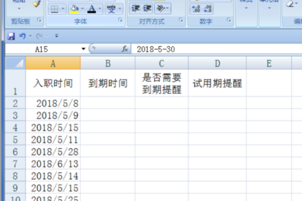 1、将Excel表格打开,在A1-D1单元格里输入需要的文字。比如:入职时间,到期时间,是否需要到期提醒,试用期提醒