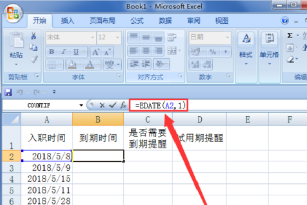 3、已经知道入职的准确时间后,我们在B2的单元格里利用输入公式快速计算出一个月试用期的到期时间。