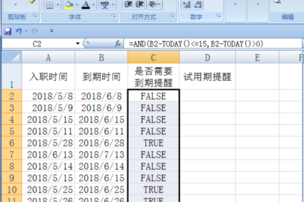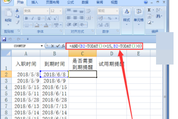 5、在C2的单元格里输入公式查看一下是否需要到期提醒。=AND到期时间,减去今天的时间,小于等于15,到期时间减去今天的时间大于等于0。