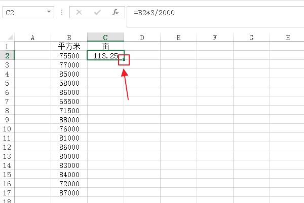 1、打开Excel表格,选中“C2”单元格,输入公式“=B2*3/2000”(1平方米=3/2000亩);