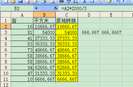 黄色区域输入亩数(与A列一样),找一个空单元格输入=2000/3或者666.6667后复制这个单元格,选中黄色区域右键-选择性粘贴-乘-确定。