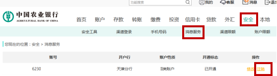 2.网银:请您登录个人网银,点击“安全→消息服务→注销”,关闭借记卡短信通知,需要验证K宝、K令。