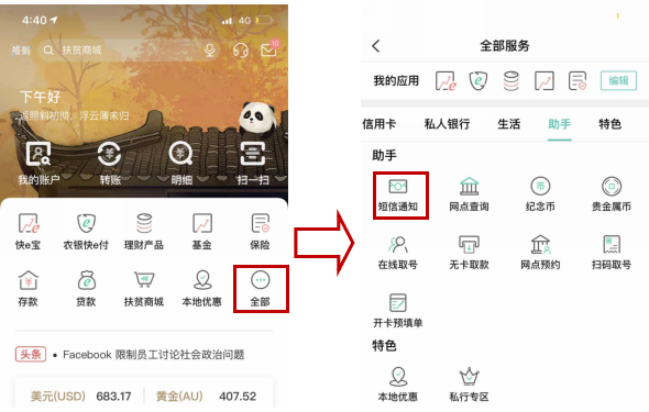 1.掌银:请您登录掌银APP,点击“全部→助手→短信通知→维护/注销”(操作时将页面上显示的绑定手机号全部清空),关闭借记卡短信通知,无需验证K宝、K令。如下图: