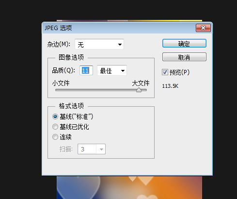 六、这时就可以弹出JPEG选项窗口了,在该窗口中可以更进一步的压缩JPG图片的大小。