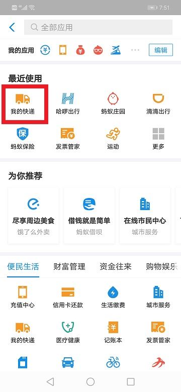 2、在相应页面中找到并点击选择“我的快递”,进入快递页面。