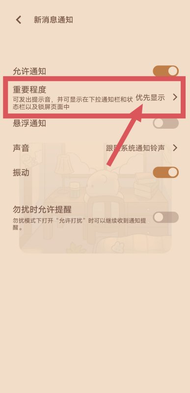 5、找到“重要程度”,点击进入,选择“优先显示”。