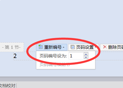 4、然后,出现用于页码设置的按钮,点击“重新编号”,并将编号设置为“