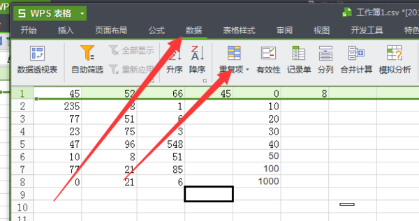 2.点击“数据”,选择“重复项”。