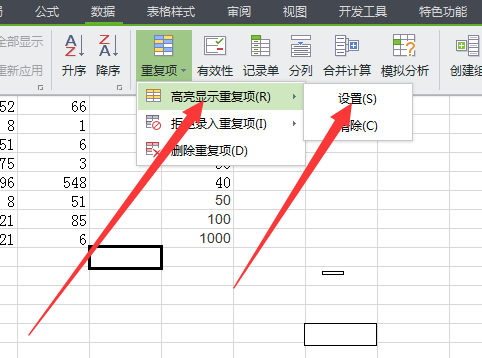 3.点击“高亮显示重复项”,选中“设置”。