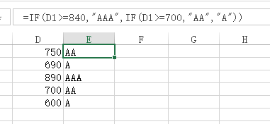 在E2中输入=IF(D1>=840,"AAA",IF(D1>=700,"AA","A")) 按回车键