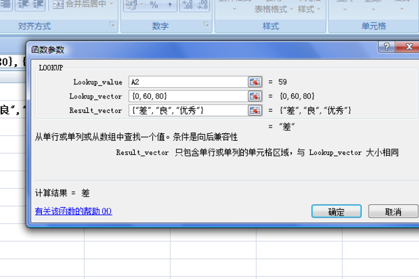 4、弹出[函数参数]对话框:将光标移到第一个参数后,直接选择表格中的单元格A2;将光标移到第二个参数后面,并在对话框中输入[{0,60,80}]。将光标移到第三个参数的后面,在对话框中输入[{“差”、“好”、“优秀”}],并在设置完所有参数后单击“[确定”按钮。