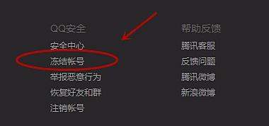 5、回到QQ官网的首页,在页面的底部单击QQ安全菜单下的【冻结账号】选项。在新弹出的页面中单击【封号解封】,然后通过手机QQ或者微信解封。