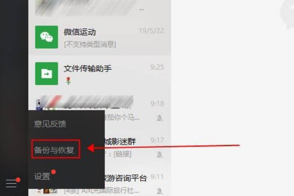 3、然后在电脑版微信点击右下角的【三】,三横标识,在打开的菜单里点击【备份与恢复】。