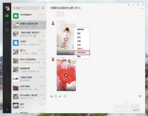 我们可以先通过图片或视频来直接找到文件存放的位置,然后记住这个位置,下次需要的时候找到这个位置就可以啦。首先我们在微信电脑版中找到之前收到的文件的聊天记录,例如在下图中,我找到的一个视频,鼠标右键视频,找到【打开文件夹】,点击进入。