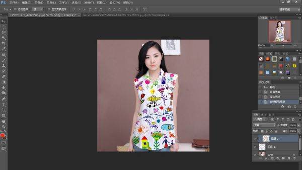 打开图案图片,按ctrl+a全选,然后复制,粘贴入需要加图案的衣服的图片,形成新图层;