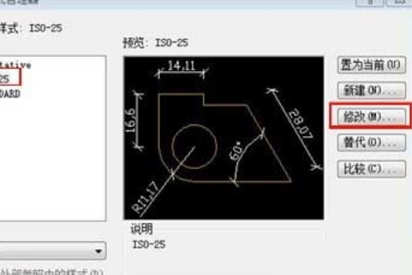 2.如图所示,CAD默认标注有两种:iso-25和STANDARD。前者是国家标准,后者是内置的。到iso-25点击修改,如下图。