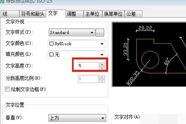 3.在弹出的对话框中选择字体,在图形位置中改变字体的高度来改变CAD标注,如下图所示。