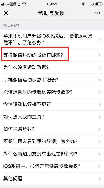 10、点击常见问题后就会进入“帮助与反馈”页面,找到“支持微信运动的设备有哪些”这个问题并点击进去;