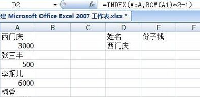 5、在E2输入公式=INDEX(A:A,ROW(A1)*2),而后确定,得出第一个份子钱