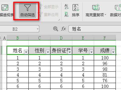 3.在数据下功能选项中,选择自动筛选,并点击,这样表格首行都出现了下拉框。