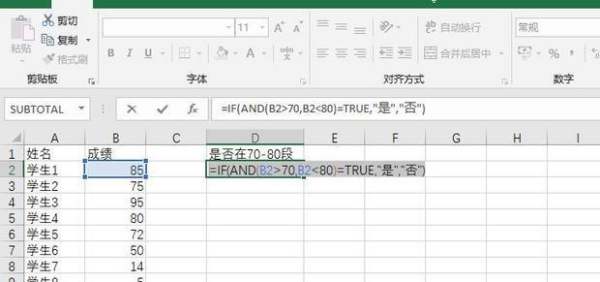 3、输入公式:=IF(AND(B2>70,B2<80)=TRUE,"是","否")AND判断是否在70-80区间,IF判断AND的值是否是True,如果是就输出是,如果不是就输出否。
